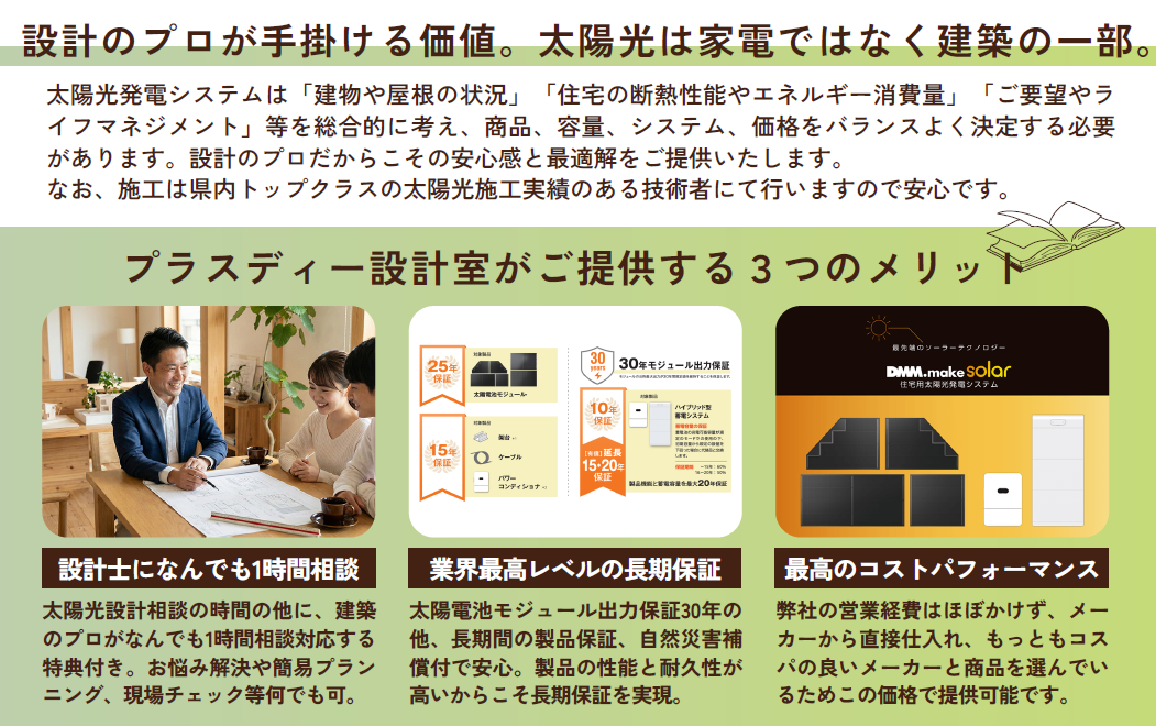 さらに、今だけ「プラスディー設計室への1時間無料相談」を特典として付けます。詳しくは下記に書きますが、新たな仕事を取ることが目的ではありません。色々と第三者の設計士に聞きたいこともあるかと思いますので、お客様の満足度向上のためのサービスを試してみることにしました。太陽光販売の話とは別に時間を設けますので、何でもご相談ください!